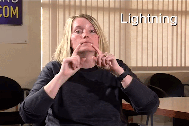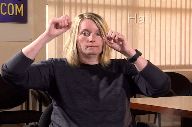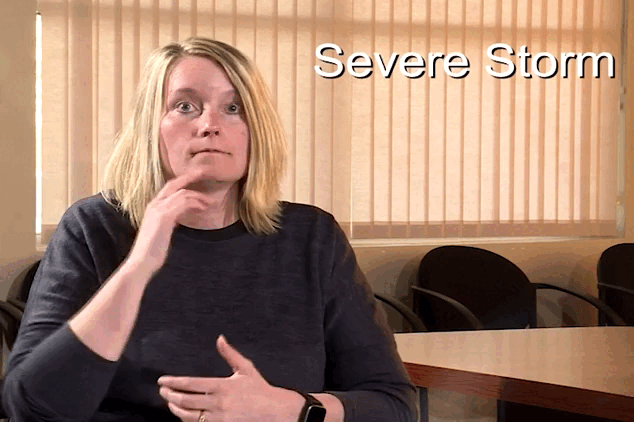 Add the “severe” portion to the general storm sign by placing your pointer finger on your chin and twisting it slightly before creating the double-hand rotation.