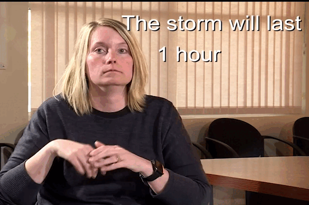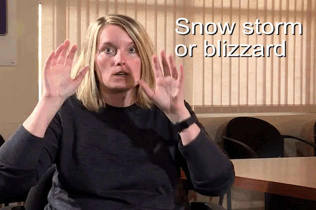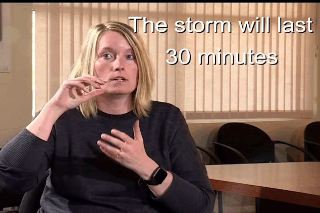 For each of the signs that show how much time has passed, I am using the general sign for storm. This is both hands out facing eachother a chest height and a bit of a rotation mimicked by each hand. Then to show that it will last close both hands into fists with the thumbs out. With palms facing out and thumbs touching move from just in front of your chin to out a few inches in an arc motion. At this point, you can add in any measure of time that fits the hazard you are covering.